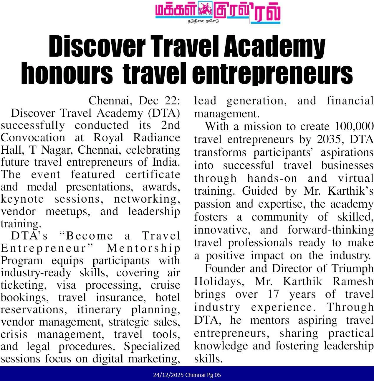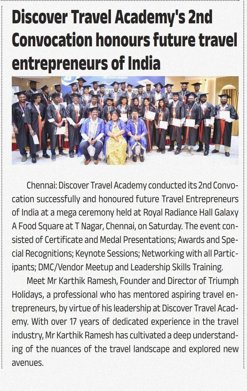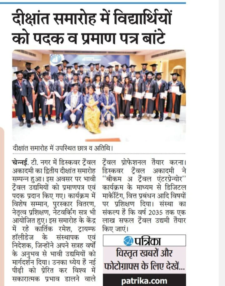 EXCELLENT Based on 25 reviews Posted on Payanis Nanban Private LimitedTrustindex verifies that the original source of the review is Google. I learned everything from the basics at Discovery Travel Academy. Karthik Sir is very friendly, supportive, and always helps us understand each topic clearly. He teaches with real examples and makes learning easy and interesting. I gained good knowledge about travel operations, ticketing, and business skills. Thank you, Karthik Sir, for your guidance and motivation! 🙏 Highly recommend Discovery Travel Academy for anyone starting in the travel field.Posted on Shalini RagothTrustindex verifies that the original source of the review is Google. If you are planning to start a business in travel and tourism this is your best bet and trust me it's worth every penny infact we can learn more than what we spentPosted on R AdityaTrustindex verifies that the original source of the review is Google. My learning experience with Discover Travel Academy has been truly amazing. The program provides an in depth understanding of the vast opportunities within the travel industry, inspiring us to build meaningful careers. They provide end-to-end insights on how to start a travel company from scratch and build it successfully. Each module is thoughtfully structured and delivered with real time examples, ensuring strong conceptual clarity. Karthik Sir deserves special appreciation for his exceptional teaching approach. His sessions are interactive, practical, and filled with valuable insights. He addresses every query with patience and ensures that every learner stays engaged throughout the learning journey. What sets Discover Travel Academy apart is it's VISION to create successful travel entrepreneurs. It’s not just about completing a course — it’s about building a strong foundation for a thriving career. Overall, It’s a great program for anyone who is passionate about travel and tourism and wants to turn that passion into a successful career. Would highly recommed.Posted on J VictorTrustindex verifies that the original source of the review is Google. Discover Travel Academy was the right choice I made to start the new chapter of my adventure World. Mr. Karthik's way of teaching, mentorship and expertise have been a complete package of learning. The support post the course is also really commendable. You are at the right place to build your future in the tourism industry.Posted on Vishnu VaradhanTrustindex verifies that the original source of the review is Google. I recently completed the “Start a Travel Business” course from Discover Travel Academy, I must say it was one of the best learning experiences I’ve had. The course gave me a lot of practical knowledge that I can directly use to start and run my own travel business. What I really liked was the SOP provided for every segment — it made each process simple and easy to follow. The trainer Mr.Karthik was very friendly and patient while clearing all our doubts, no matter how small. Their real-world experience and step-by-step explanations made the sessions engaging and meaningful. Overall, this course is truly value for money and perfect for anyone who wants to understand the travel business in a practical way. I feel much more confident now to start my own travel company, thanks to Discover Travel Academy!Posted on Krishnakumar RTrustindex verifies that the original source of the review is Google. I would like to express my heartfelt thanks to Karthik Sir and the entire team for providing me with valuable insights into the travel industry. Karthik Sir's training sessions were truly exceptional—his deep knowledge, kindness, and willingness to patiently clarify doubts made the learning experience both enriching and enjoyable. I'm sincerely grateful for this amazing opportunity. Thank you once again, Karthik Sir!Posted on Anuvarshini VijayTrustindex verifies that the original source of the review is Google. *"Life-Changing Experience at Discovery Travel Academy!"* I'm Anuvarshini from Chennai... I'm absolutely thrilled with my experience at Discovery Travel Academy! The training program is comprehensive, well-structured, and delivered by experienced professionals like Mr. Karthick, who makes complex concepts easy to understand. I enjoyed the entire Session. Each subjects crystal clear and deep insights knowledge of tourism... The academy provides a supportive learning environment, and the curriculum covers all aspects of the travel industry. I've gained invaluable knowledge and skills to kick-start my career in travel. I highly recommend Discovery Travel Academy to anyone looking to pursue a career in travel. The academy's reputation, expertise, and dedication to student success are truly commendable. Discovery Travel Academy is the best one. Thank you, Discovery Travel Academy, for helping me achieve my goals!Posted on Rajesh ptrTrustindex verifies that the original source of the review is Google. This discover travel academy was a huge step towards the next step in my life. Thank you so muchPosted on FayasudeenTrustindex verifies that the original source of the review is Google. Hi this is fayasudeen from reaNsea holidays Chennai. Initially I was sales executive in company named GEM money charges pvt Ltd Chennai. My MD Mr Mohamed Sukri notice that I have intrest in travel industry so he guided me to join in this course. After joining I came to know about the travel industry and how to become a successful travel entrepreneur in current era. This course was so helpful and support me grow in this industry. Now I have started my company named reaNsea holidays and now I am gathering my team to develop my company. This course is too trusted course after completing this we will become a travel entrepreneur. Thank you so much Mr Karthik Ramesh for guiding us and still you are giving knowledge to us even after completing our course. I feel very proud and happy to give this. Thank you sir thank you so muchP